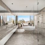 - Floating vanities with custom storage solutions